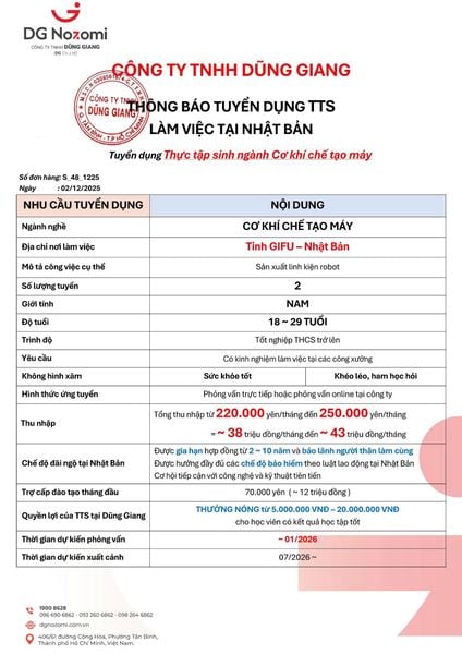 Công ty TNHH Dũng Giang (Dũng Giang Nozomi) cung cấp việc làm chất lượng cho người lao động Việt Nam tại Nhật Bản. Chúng tôi tự hào là 1 trong 13 doanh nghiệp xuất khẩu lao động được cấp phép đưa thực tập sinh ngành Điều dưỡng – Hộ lý sang Nhật Bản làm việc. Tại DG Nozomi, hàng trăm công việc, hàng chục đơn tuyển liên tục mỗi tháng với mức lương và chính sách đãi ngộ hấp dẫn từ các công ty, nghiệp đoàn tại Nhật Bản