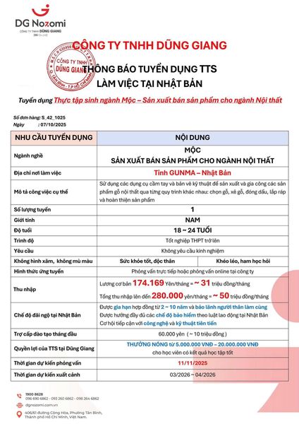 Công ty TNHH Dũng Giang (Dũng Giang Nozomi) cung cấp việc làm chất lượng cho người lao động Việt Nam tại Nhật Bản. Chúng tôi tự hào là một trong những doanh nghiệp xuất khẩu lao động được cấp phép đưa thực tập sinh ngành Điều dưỡng – Hộ lý sang Nhật Bản làm việc. Tại Dũng Giang Nozomi, hàng trăm công việc, hàng chục đơn tuyển liên tục mỗi tháng với mức lương và chính sách đãi ngộ hấp dẫn từ các công ty, nghiệp đoàn tại Nhật Bản