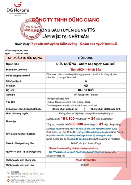 Công ty TNHH Dũng Giang (Dũng Giang Nozomi) cung cấp việc làm chất lượng cho người lao động Việt Nam tại Nhật Bản. Chúng tôi tự hào là một trong những doanh nghiệp xuất khẩu lao động được cấp phép đưa thực tập sinh ngành Điều dưỡng – Hộ lý sang Nhật Bản làm việc. Tại Dũng Giang Nozomi, hàng trăm công việc, hàng chục đơn tuyển liên tục mỗi tháng với mức lương và chính sách đãi ngộ hấp dẫn từ các công ty, nghiệp đoàn tại Nhật Bản
