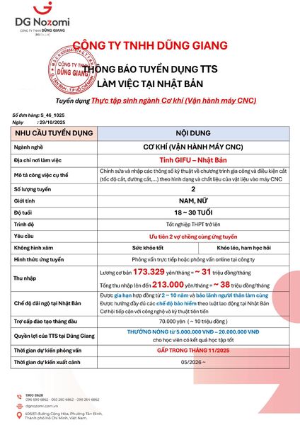 PHỎNG VẤN NGAY CÔNG VIỆC CƠ KHÍ - VẬN HÀNH MÁY CNC GẤP TRONG THÁNG 11